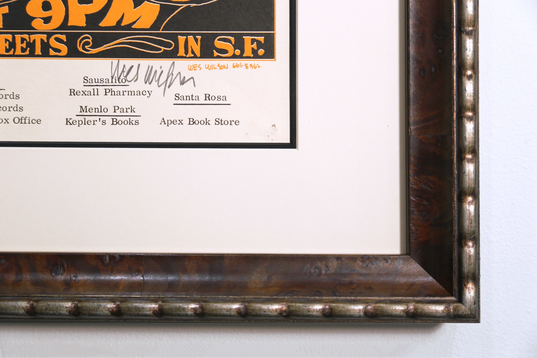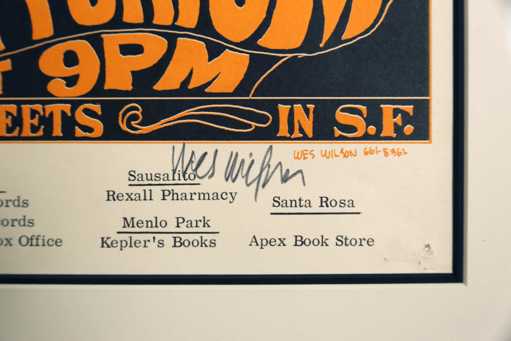 The other band was the Mothers of Invention with Frank Zappa. Putting the Velvets and Frank Zappa together with an appearance by Andy Warhol was one of the more inventive ideas that Bill Graham had. The art was done by Wes Wilson and he hand-signed this poster in pencil. This artwork is one of the most coveted of the early 1966 posters.