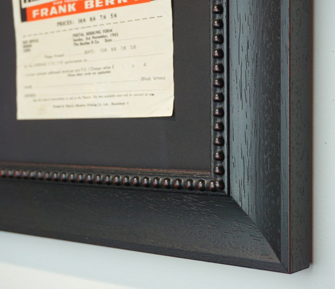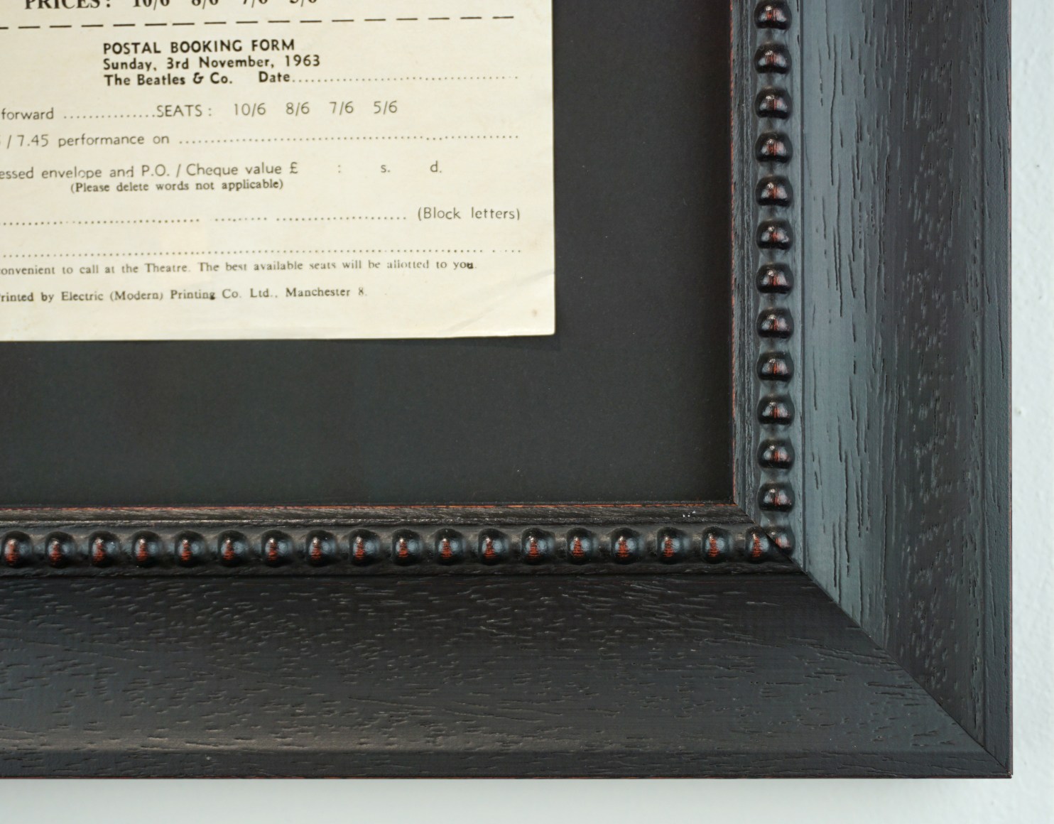 This is a thin but colorful 5" x 11.75" handbill which is difficult to find in this condition. It features photo portraits of each Beatle as well as The Brook Brothers. The postal booking form at bottom is unused and was designed to be removed to be sent away for tickets by mail. This piece has moderate handling wear with a tiny spot of staining at lower right. A classic early Beatles concert piece. Scarce.