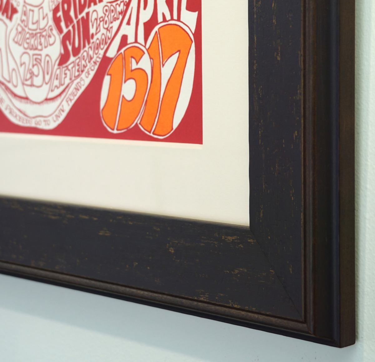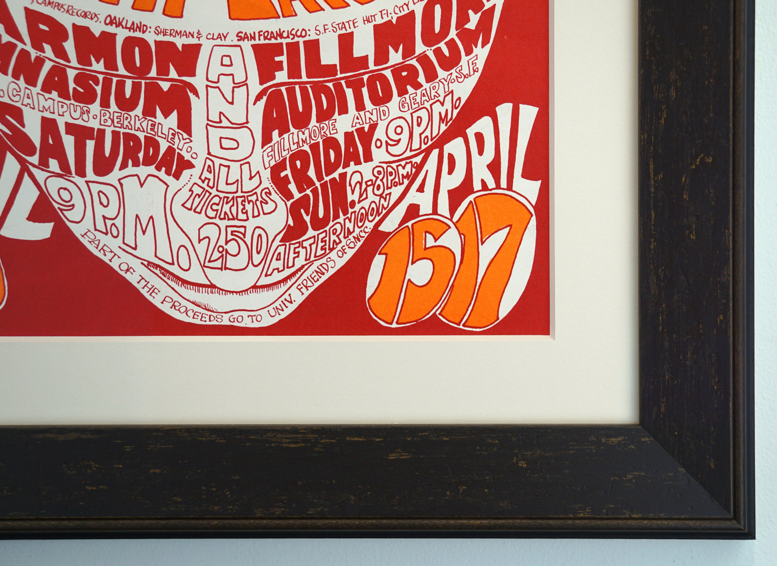 “A Blues Rock Bash” is the title of this image, which features The Paul Butterfield Blues Band and Jefferson Airplane. The image is shaped like a human head and the lettering forms the facial features. As an early Bill Graham poster, these were printed in small quantities, making them very scarce today.