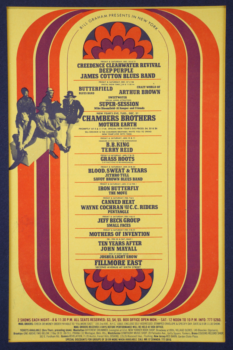Some of the performers featured on this handbill, which covered December 20 1968 through March 1, 1969 include: Creedence Clearwater Revival, Deep Purple, Jethro Tull, Mike Bloomfield & Al Kooper’s Super Session, BB King, Blood Sweat & Tears, Frank Zappa and the Mothers of Invention, Jeff Beck, Iron Butterfly.