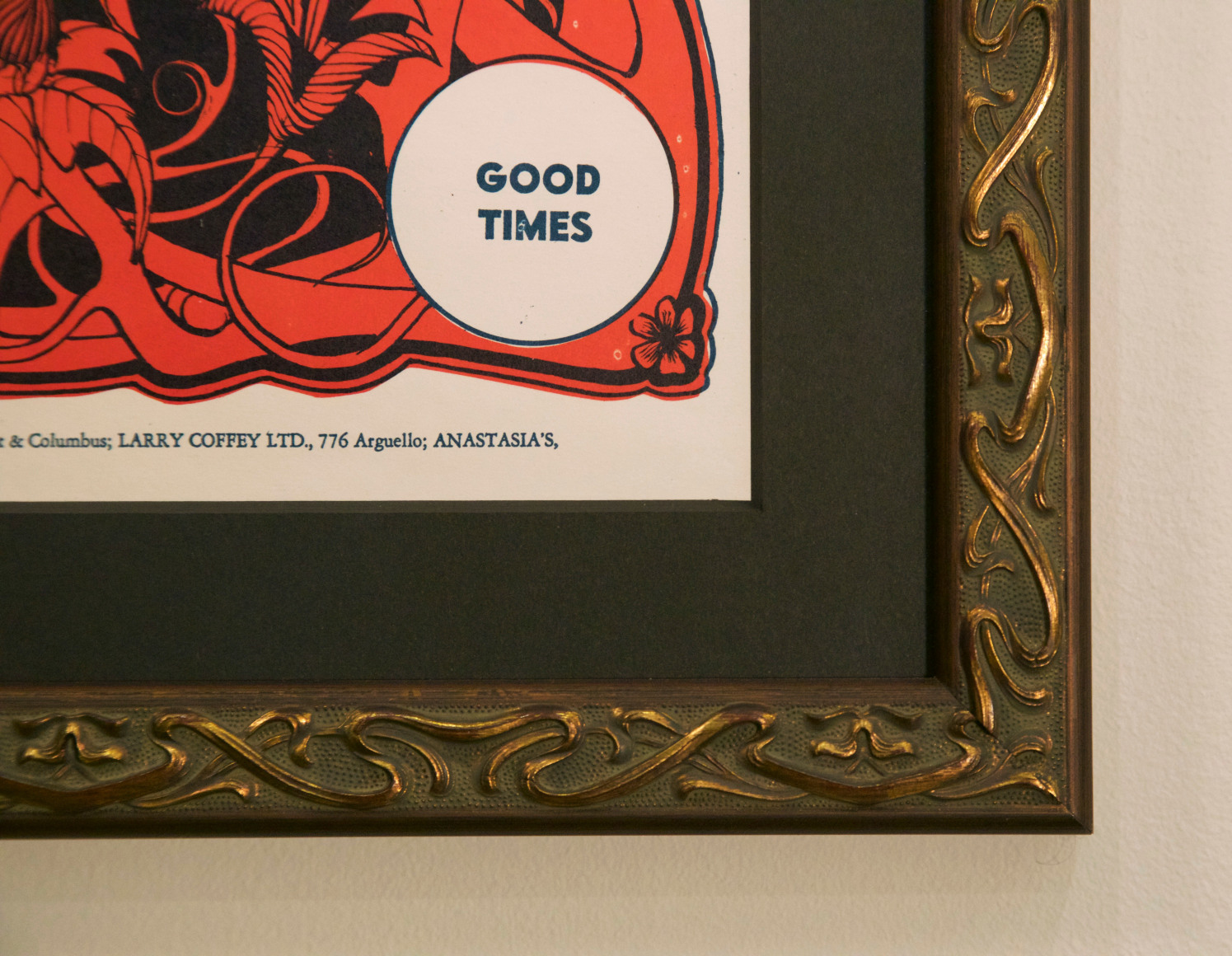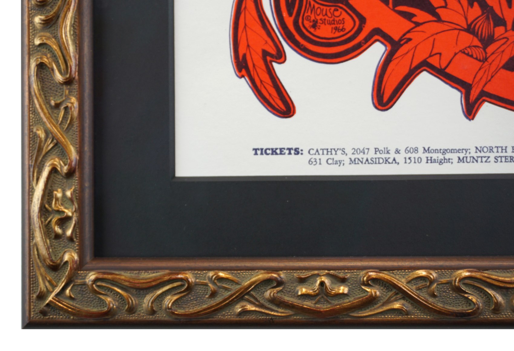 Mouse and Kelley worked together on their posters, actually sharing a large drawing table as Mouse is right-handed and Kelley was left handed. Typically, Kelley selected the image and laid out the poster while Mouse did the illustration. And according to Rusty Goldman, the people pictured on the poster are Dr. George Auger, the Cardiff, who was the tallest man on earth at the time with his family. The Art Nouveau style was both organic and psychedelic in nature and was often used by Mouse, Kelley and fellow Big Five poster artist Rick Griffin.