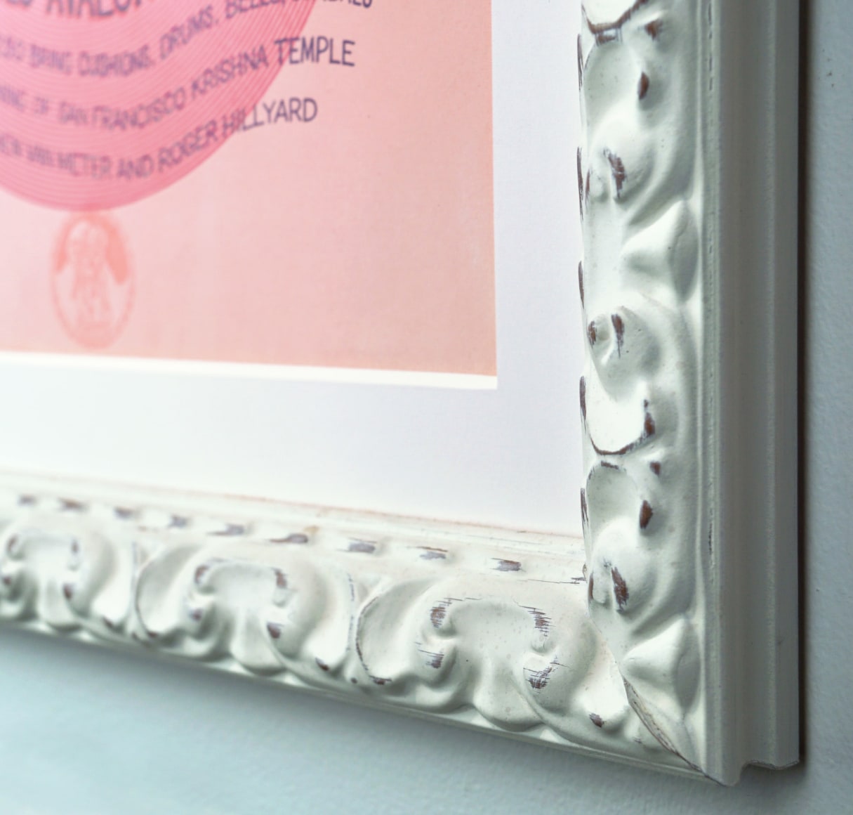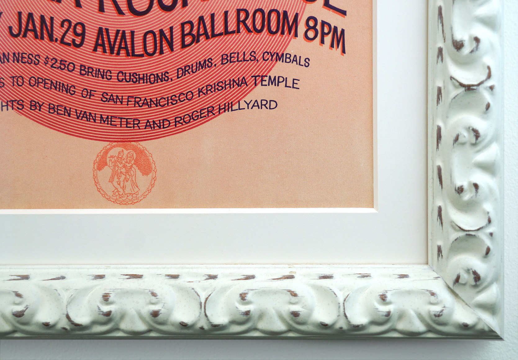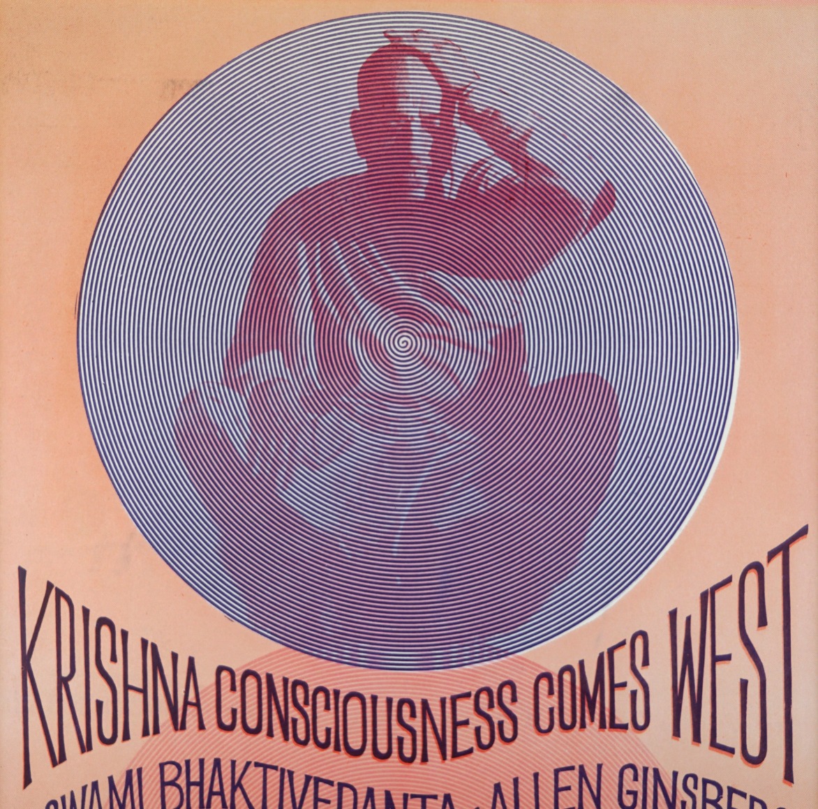 Artist Harvey Cohen, one of the first ISKCON followers, designed this Stanley Mouse-inspired promotional poster with a picture of Prabhupada, details of the event, and a request to "bring cushions, drums, bells, cymbals." The Mantra-Rock Dance concert was later called "the ultimate high" and "the major spiritual event of the San Francisco hippie era." It led to favorable media exposures for Prabhupada and his followers, and brought the Hare Krishna movement to the wider attention of the American public