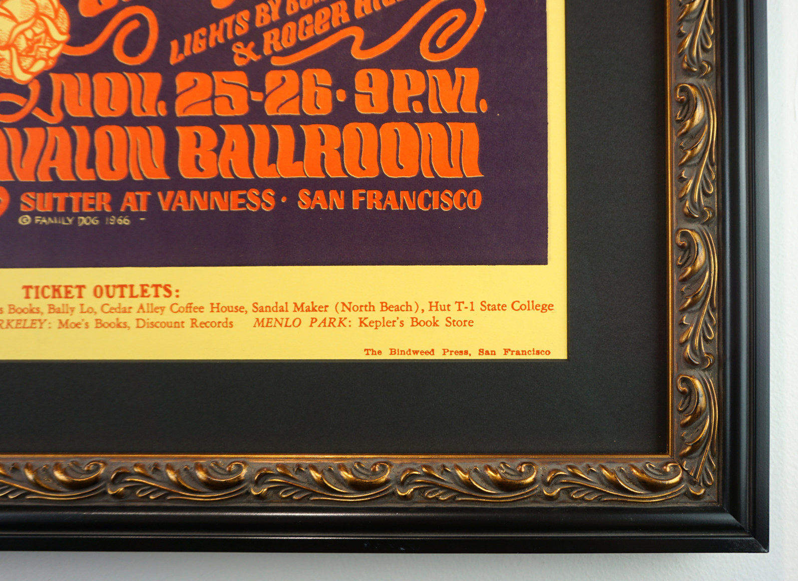 Hesitant at first to jump on the San Francisco School bandwagon, Moscoso designed his first Avalon poster in June 1966, but this one, in late November, was only the third poster he created. Soon though he would become the first of the San Francisco poster artists to create his own branded creations, the Neon Rose series, which he launched about a month after this piece.