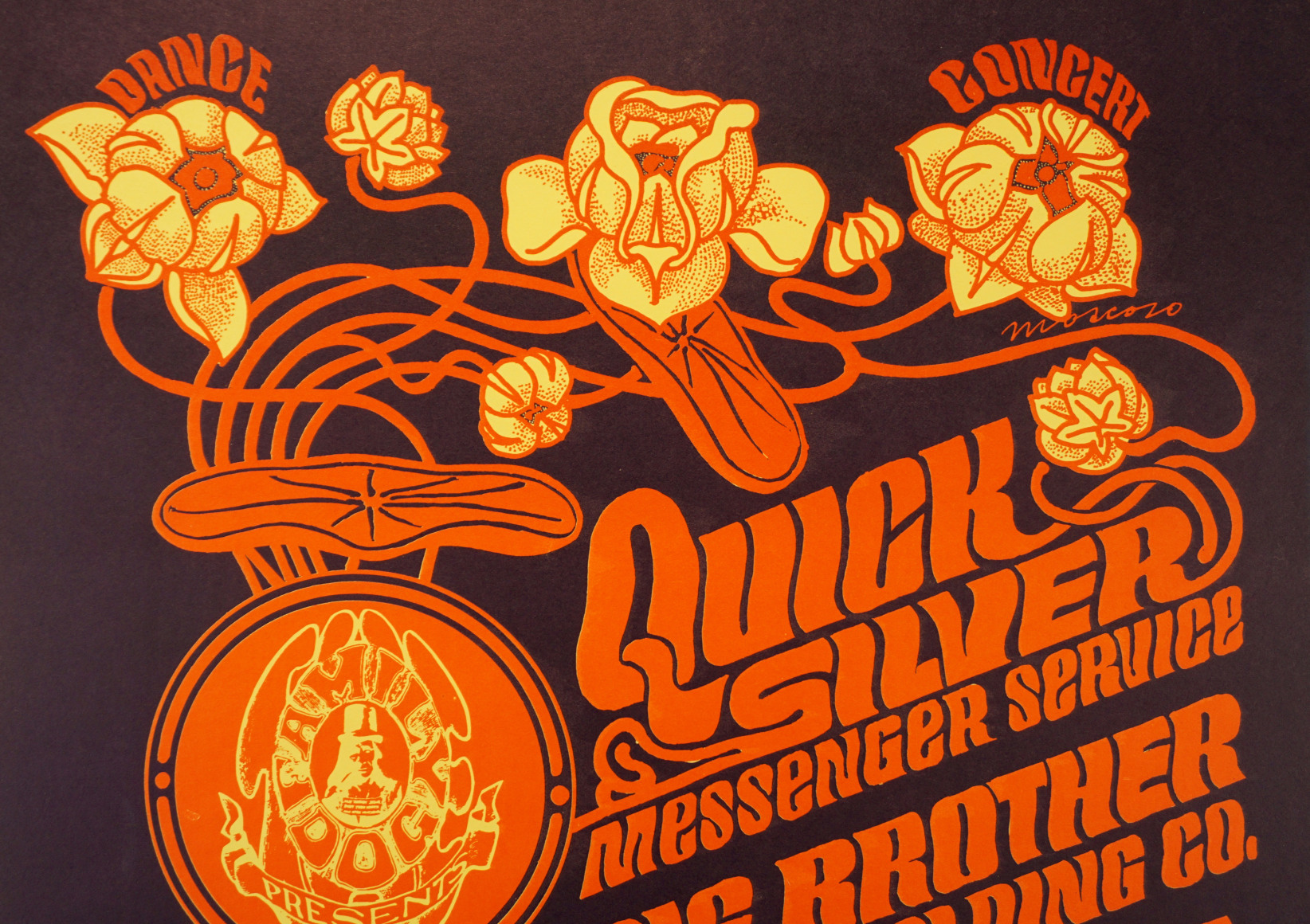 FD-36 is one of the earliest posters designed by Victor Moscoso. It displays a restrained use of color that would become atypical of Moscoso’s work. A nicely drawn floral design straight out of the Art Nouveau handbook surrounds the band names and incorporates the Family Dog logo. Moscoso took the image from the cover of some old sheet music for a song in a German Opera. At the time Moscos was right on the verge of figuring out how to make psychedelic posters and he was influenced by Mouse and Kelley for this image appropriation.