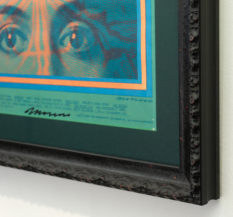 A rare first printing poster advertising The Doors , Sparrow and Country Joe & The Fish, signed for you by Victor Moscoso.  The figure’s head is electrified and the words “Break on through to the other side” are printed above. “Break on Through” was the Doors first single and the record company make them change a line, “she gets high,” to  “she gets….she gets…she gets…and then a muffled moan by Jim Morrison.