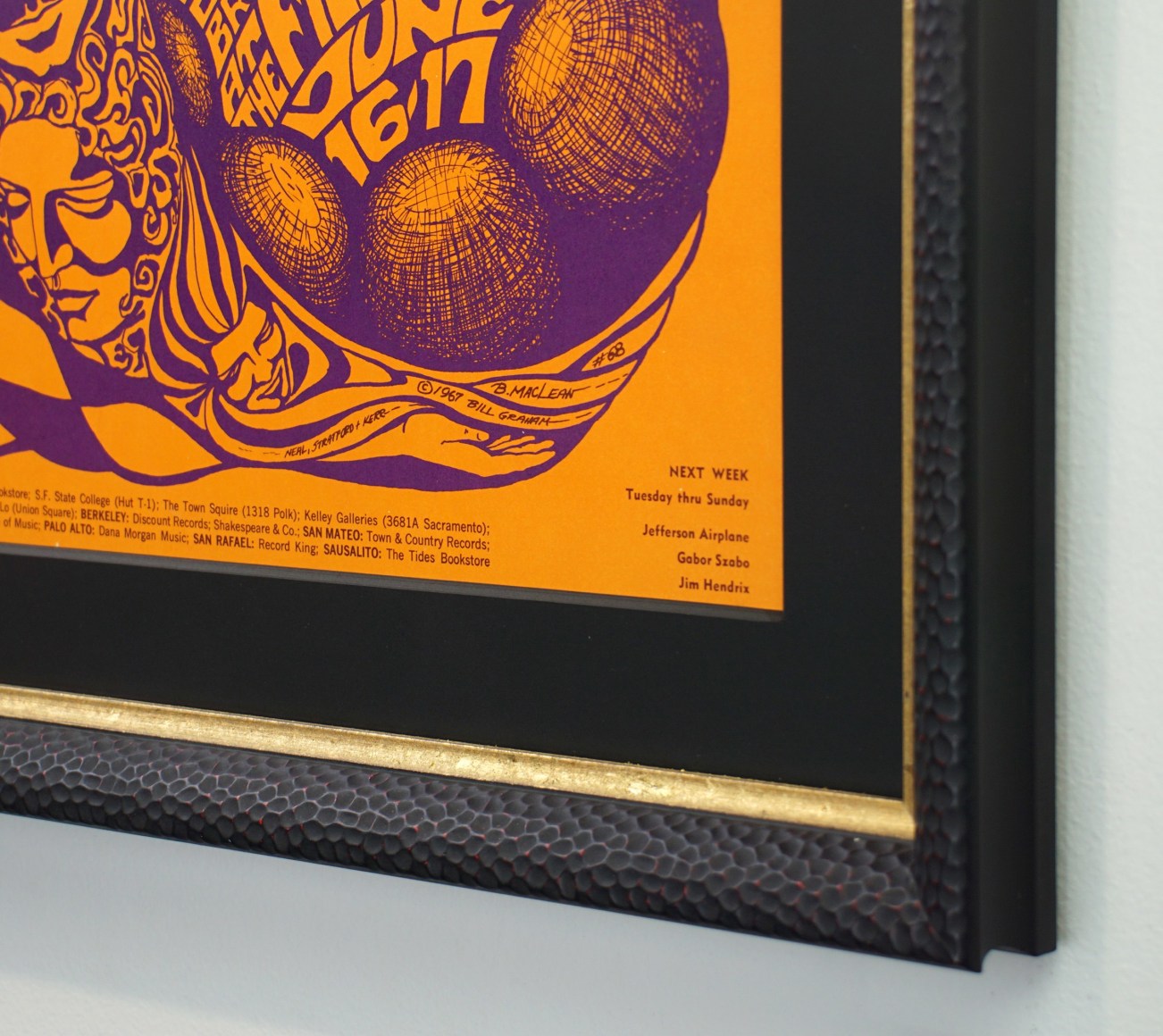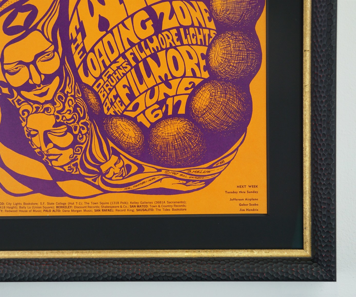 And coming next week…”Jim” Hendrix! This poster advertised The Who playing at the Fillmore the same weekend as the Monterey Pop Festival and in fact that is where artist Bonnie MacLean and her new husband Bill graham were spending that weekend on their Honeymoon. In the bottom right hand corner of the poster you will see next week’s bill, the Jefferson Airplane, Hungarian Jazz guitarist Gabor Szabo, and the obviously unknown “Jim Hendrix.”