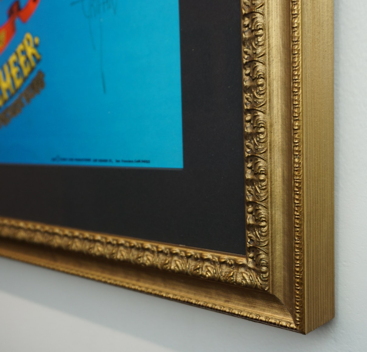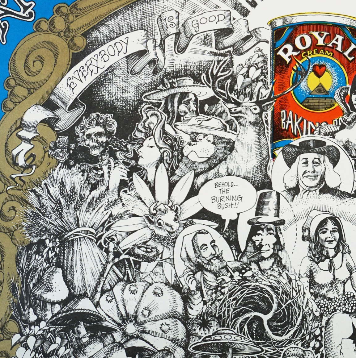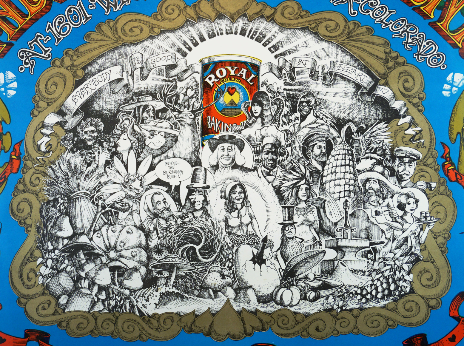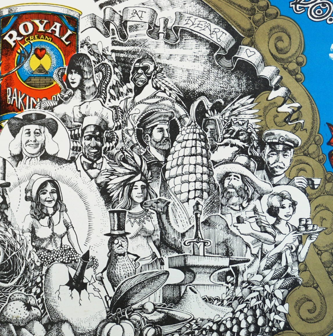 The very detailed pencil art in the center features images of many famous advertising-related characters such as Elsie the Borden Cow, Mr. Peanut, Zig Zag Man, Smokey the Bear, Quaker Oats Man, Admiral Tobacco Man and other figures such as The Grateful Dead skeleton and roses along w/additional images of mushrooms, pumpkins, etc. How many icons, mascots and references to other posters from the era can you name?