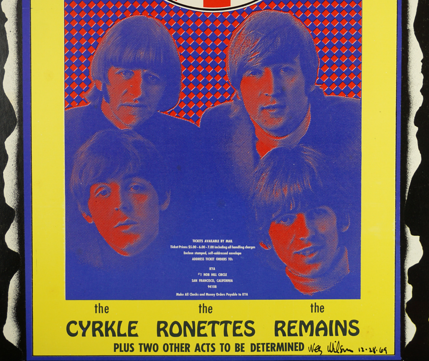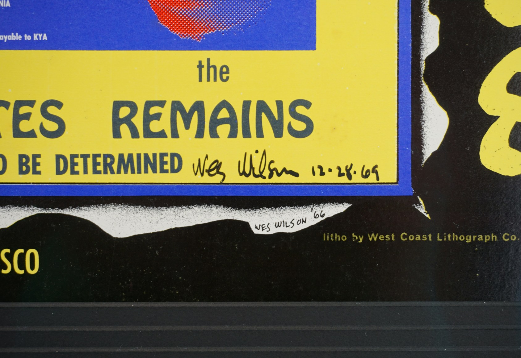 This poster is exceptionally rare and historically significant. It is the only Beatles concert poster to have been created by the psychedelic school of artists - in this case by the Father of the Psychedelic poster, Wes Wilson. Although they made an unannounced live appearance in January 1969 on the rooftop of the Apple building, this poster advertises the FINAL Beatles concert ever. The press run was exceptionally small - only 300 posters were printed, and this is one of maybe 100 that have survived. Finally, it has a Wes Wilson signature that is dated 12/28/69.