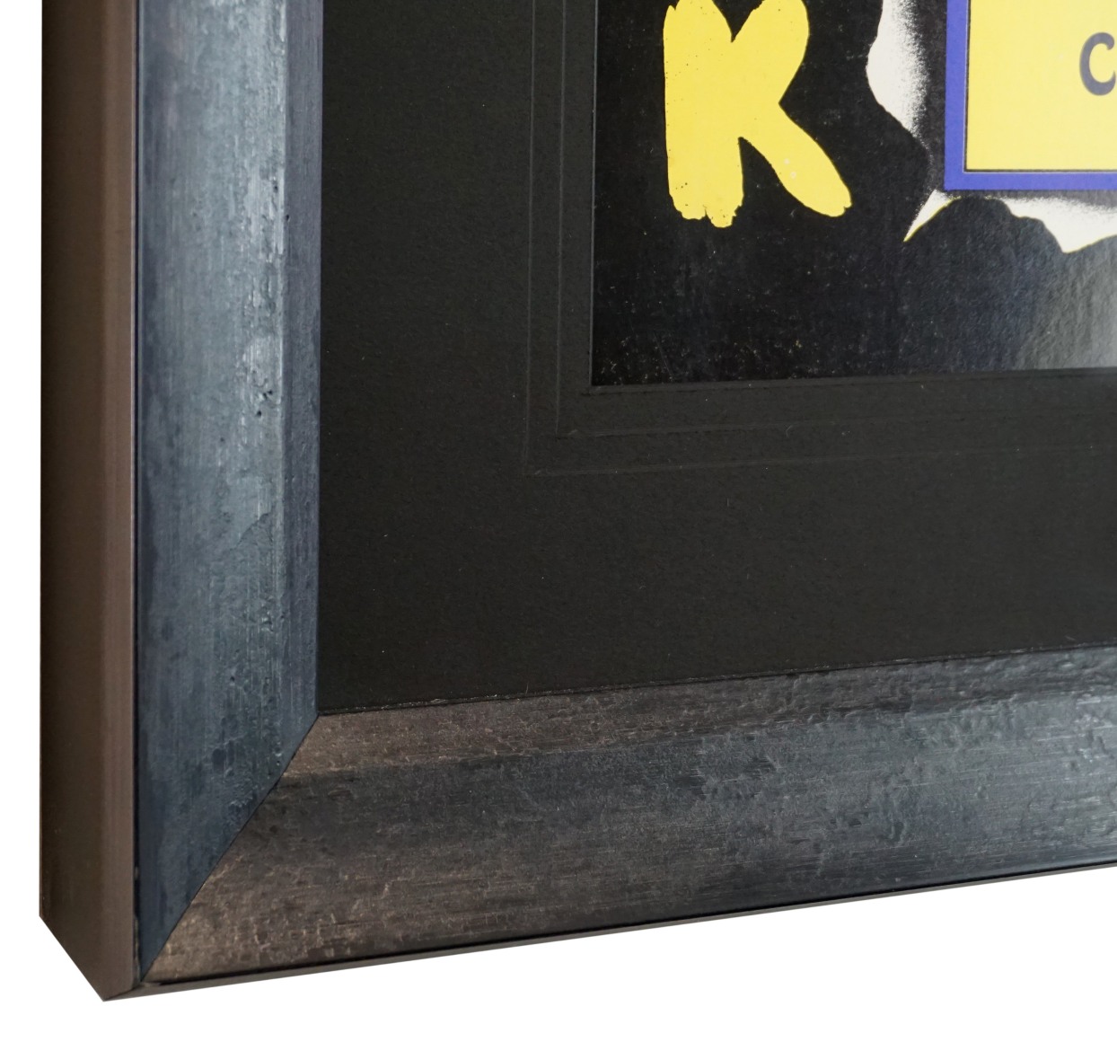 Excellent. Some light scuffing. Overall light abrasion on upper left hand black border. Slight handling dents at top middle. Some handling wear along bottom edge, bottom left corner has a slight bend. Yellow border has a slightly discolored “dot” by the “s” in “remains.” And there is another, smaller dot about an inch above. Three slight circular discolorations are going up the left border plus one very small dot by upper left corner of yellow border.