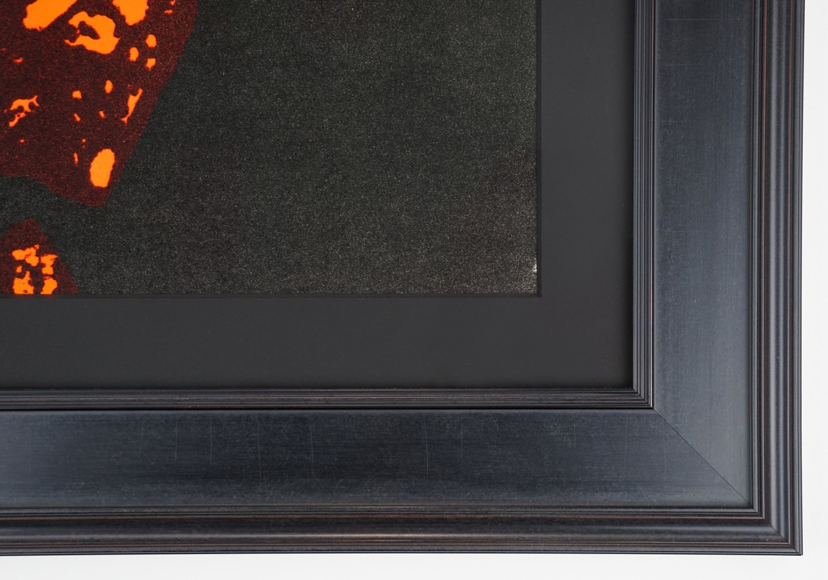 This large blacklight poster juxtaposes bright orange day-glo fluorescent ink set off against the Beatles in black and adds flocking for that extra cool vintage feel. A flocked poster has black fibers that feel felt- or velvet-like. The black appears much darker than an ink with no glare and gives great contrast to the fluorescent UV reactive inks.