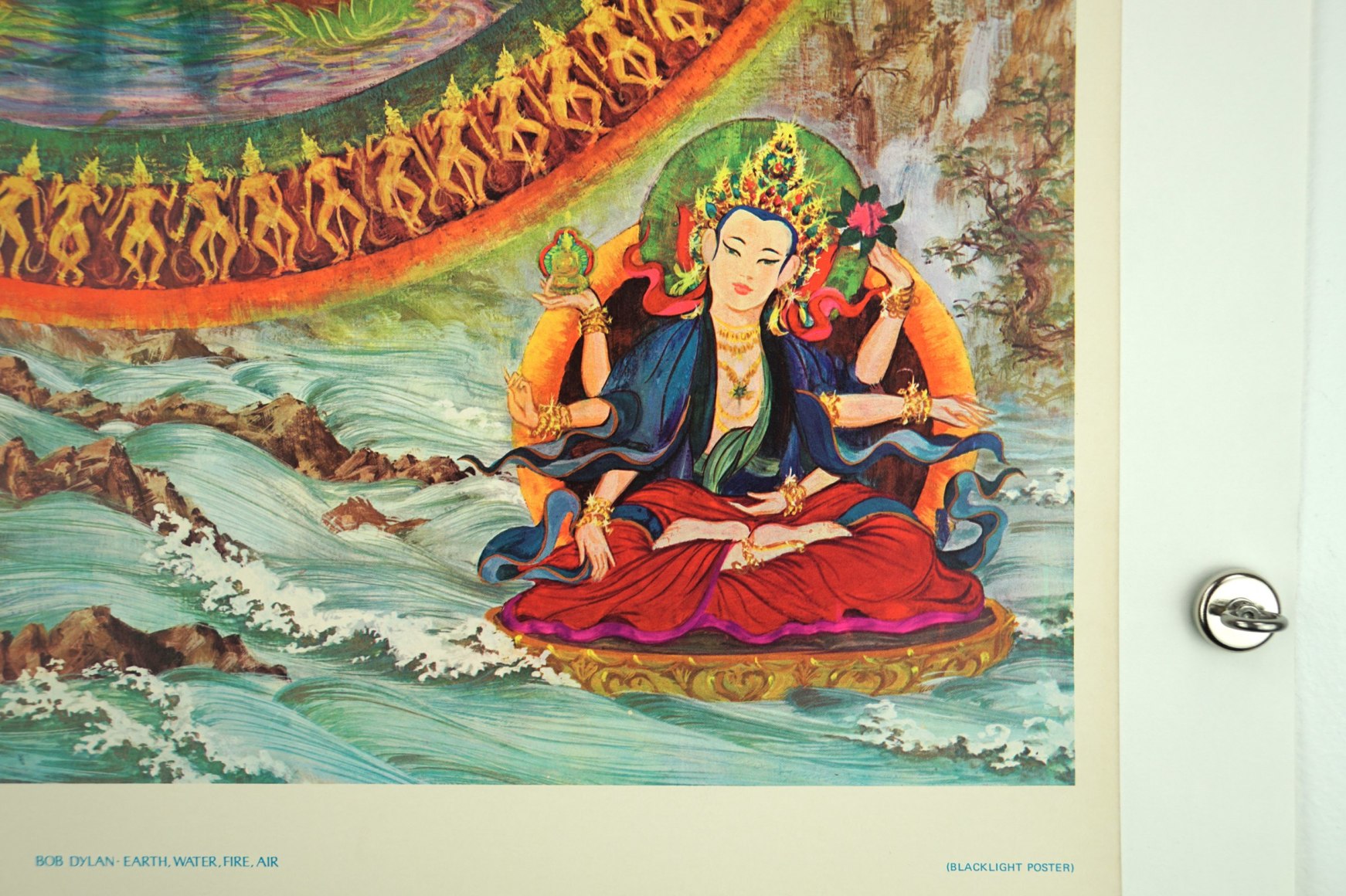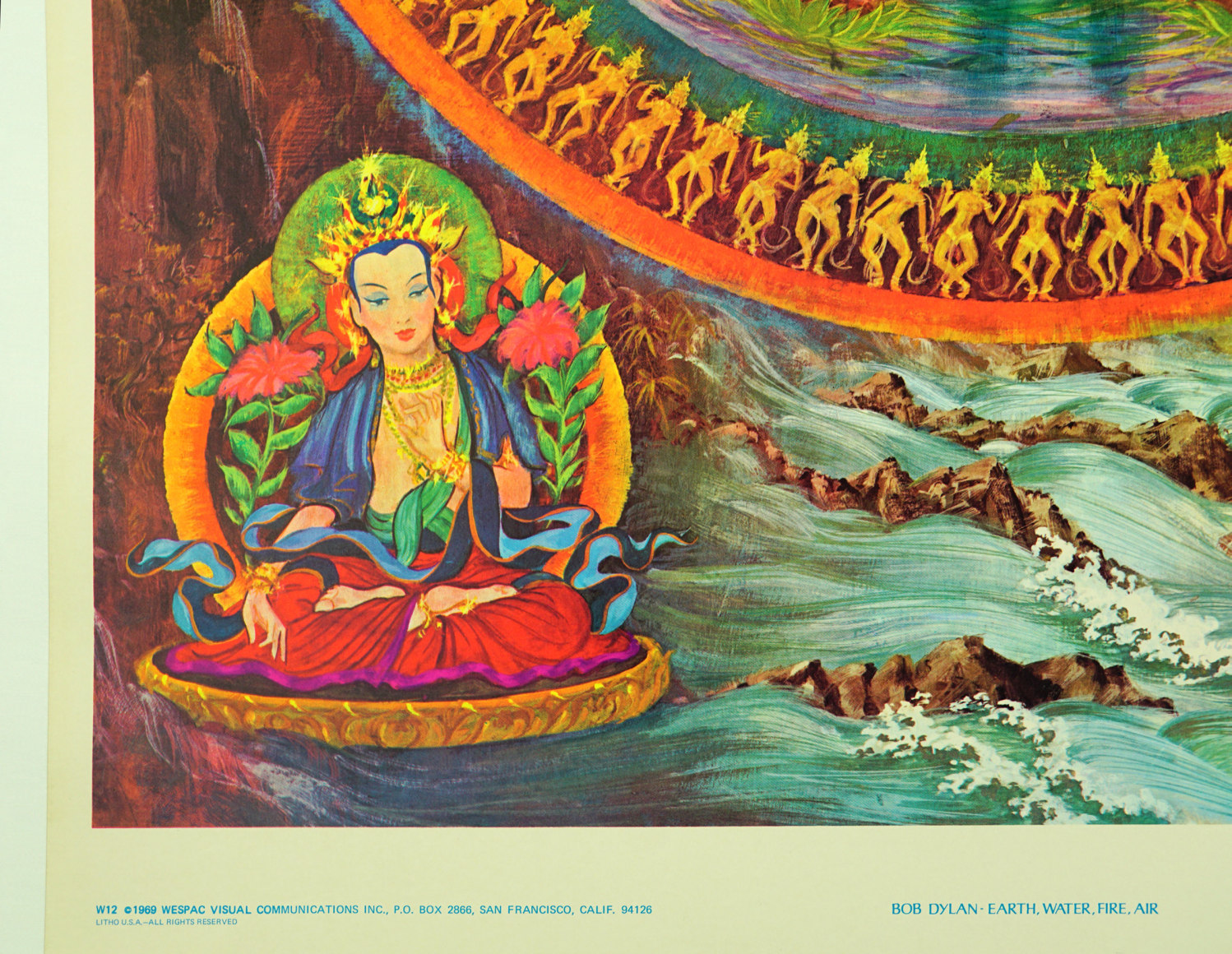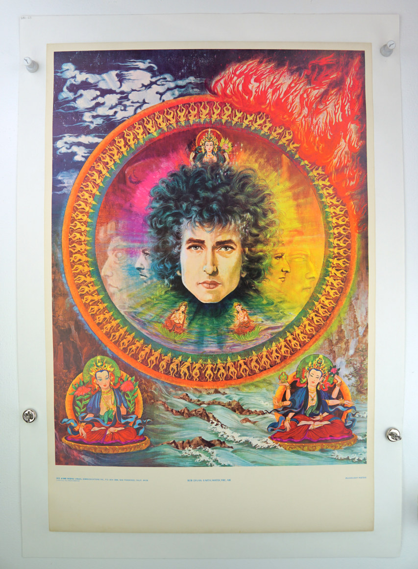 San Francisco’s Wespac Visual Communications produced this black light poster with Bob Dylan as its central image, surrounded by the Four Elements. It is listed as W12 which would be one of the earlier Wespac posters. Posters were the lingua franca of the baby boomer generation in the late 1960s and early 70’s They were inexpensive, didn’t need to be framed, and could be easily and cheaply replaced as the times changed. Wespac was one of many companies that sprung up across the country to fill the enormous demand.