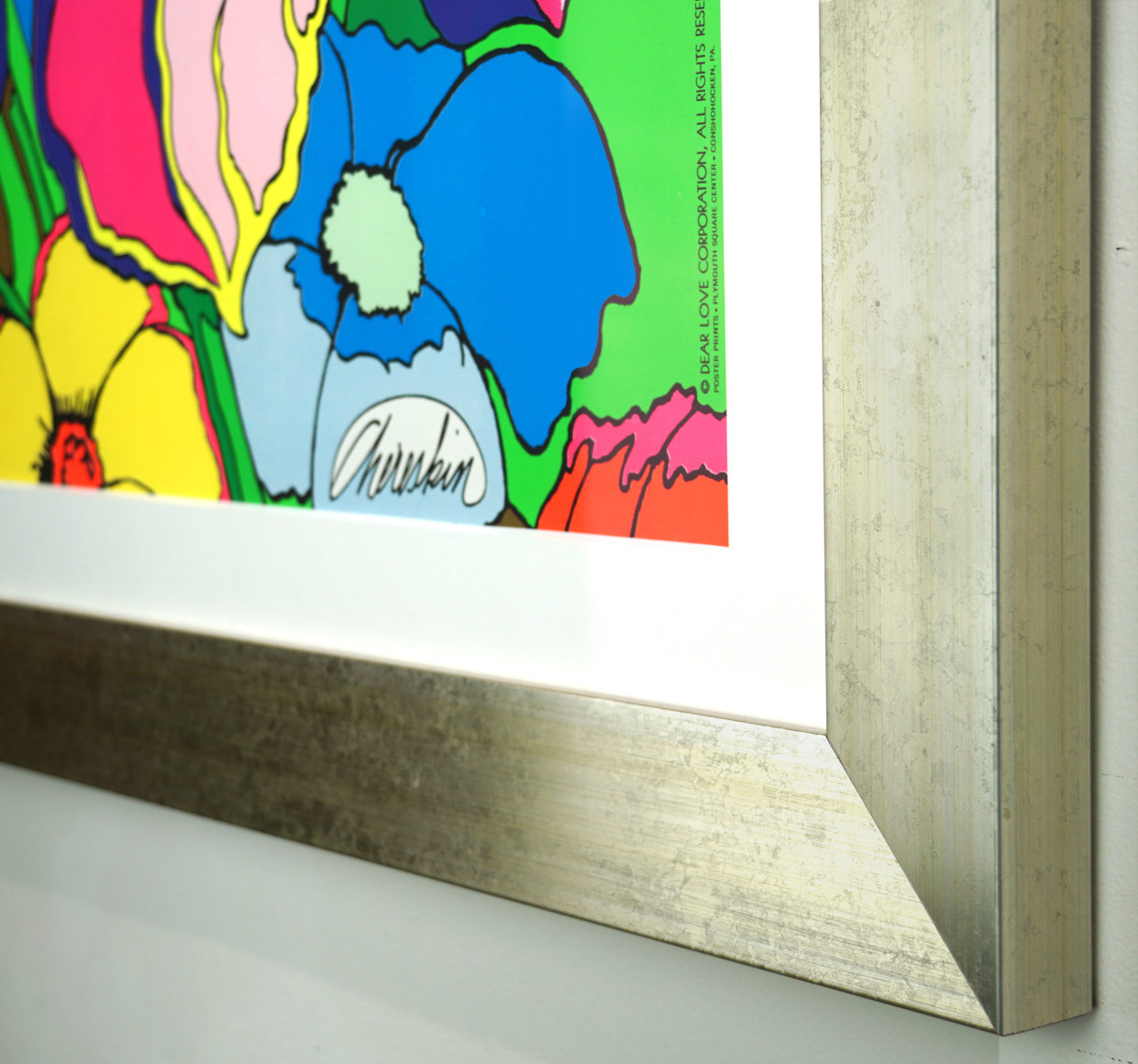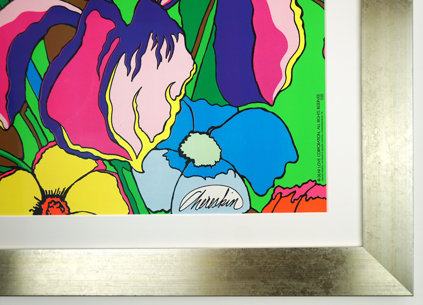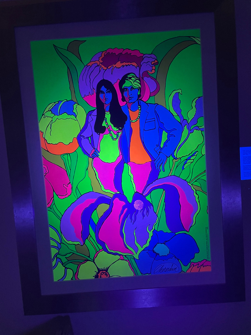 This huge blacklight poster was produced by Poster Prints in Plymouth Square Center, Conshohoken, PA. At the time, posters were the rage among young people and many printers sprang into action to fill the demand. That this is essentially a fashion poster ironically points the direction that artist Ron Chereskin would later take – as a leading designer of bed bath and home items including a current line of scented candles!