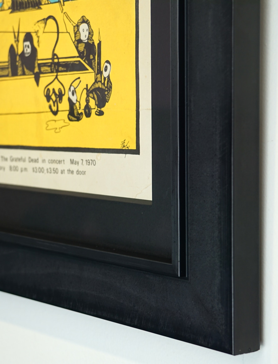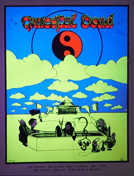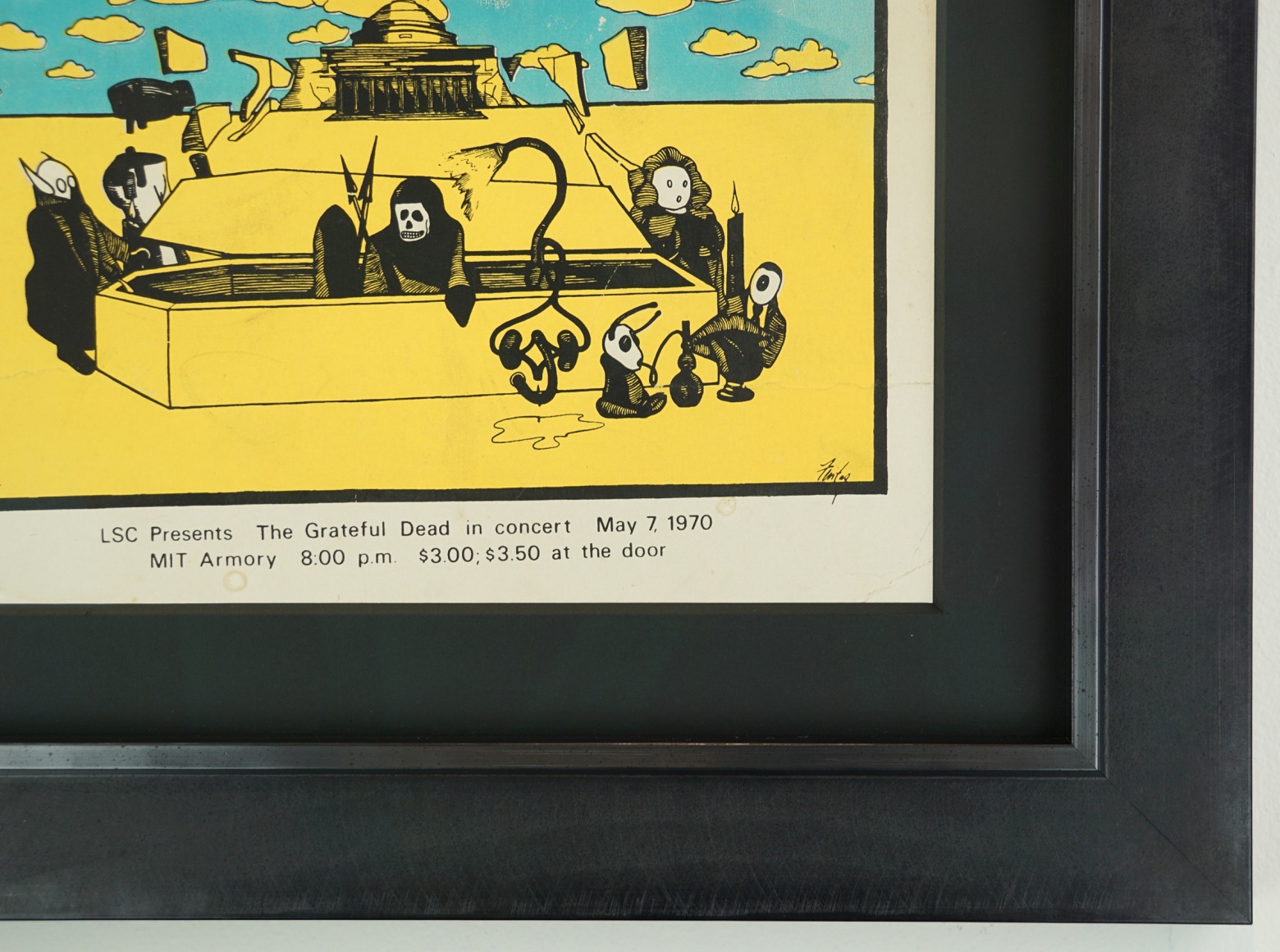 Super-rare poster from an epic era for the Dead as they toured colleges in the Northeast. The Dead pulled into Cambridge the day before this show and on May 6th, they played a free, performance outside the student union in support of the nation-wide student strike that took place in the days after the May 4th Kent State shootings.
