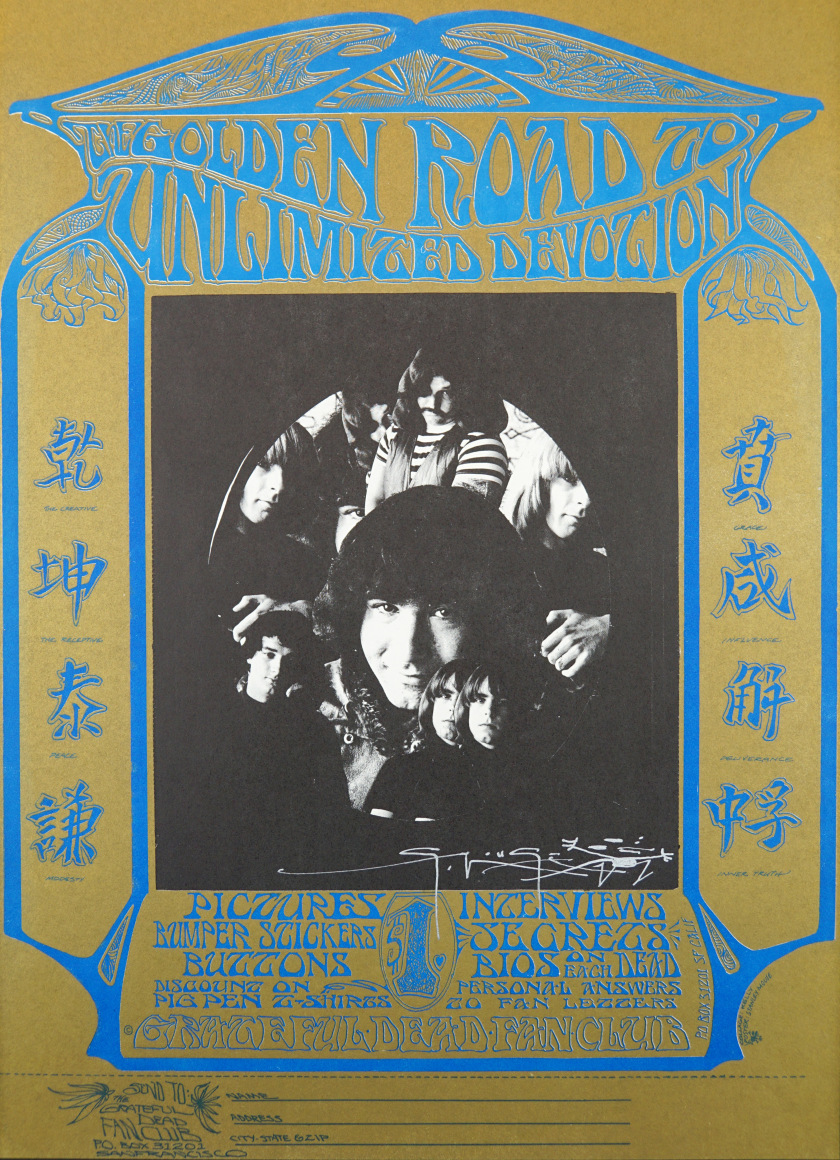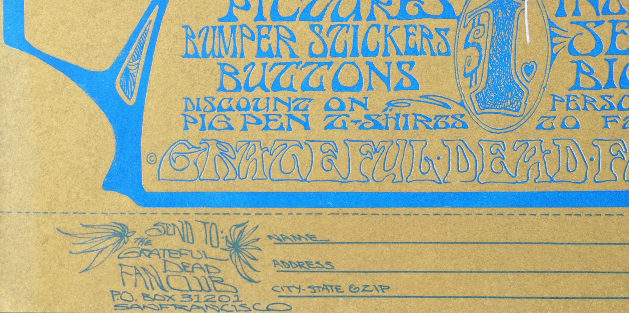This design was used to promote the Grateful Dead Fan Club. The central design is a photo collage of the Dead in their very early years. The poster promises such things as pictures, bumper stickers, interviews, and secrets, as well as personal answers to fan mail and discounts on Pig Pen t-shirts - all for only $1!