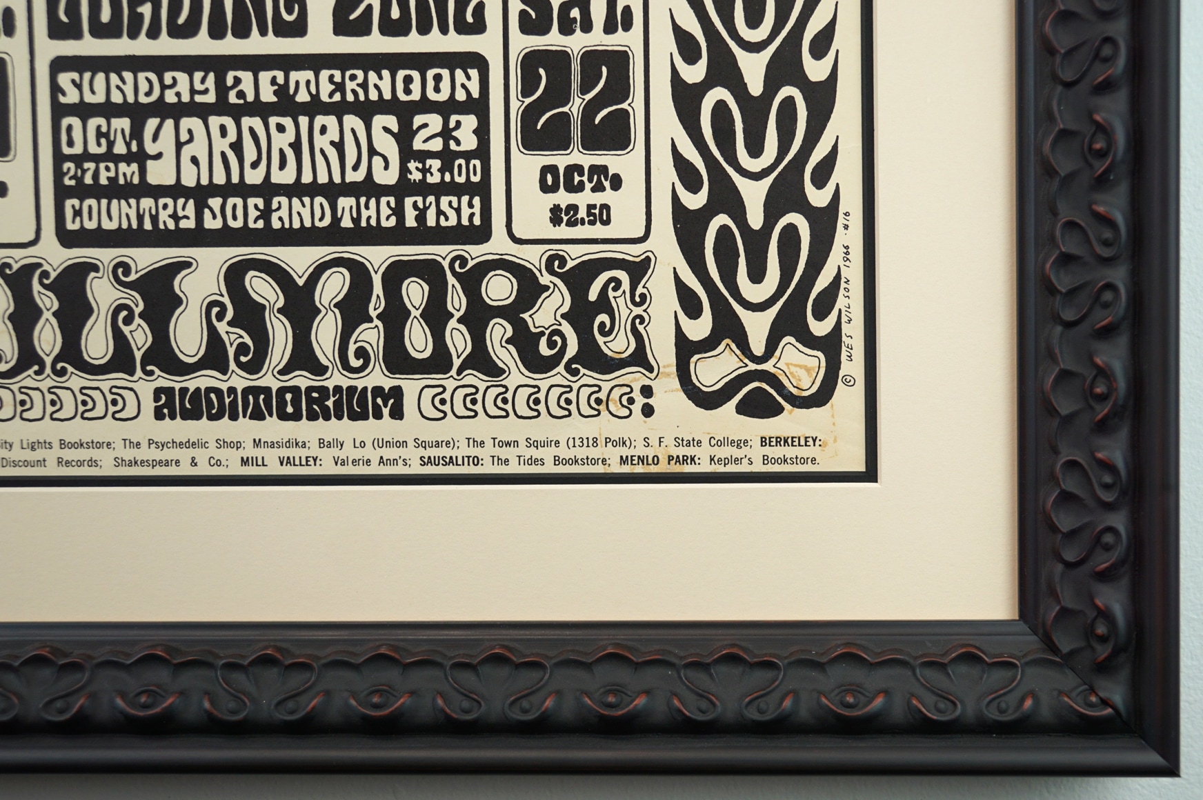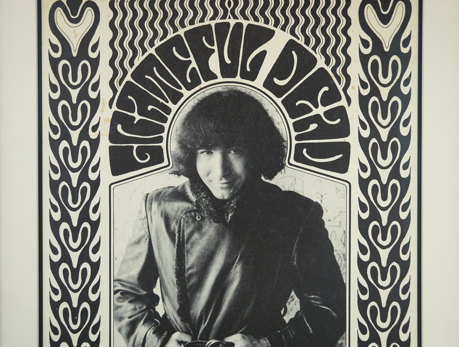 This concert merges the lettering of Wes Wilson – where you can easily see the Vienna Secessionist influence – and a photo of a young and beardless Jerry Garcia by Herb Greene. Greene was one of the early photographers of the Haight-Ashbury music scene. If you look closely at the background behind Jerry, you will see some small wall etchings.