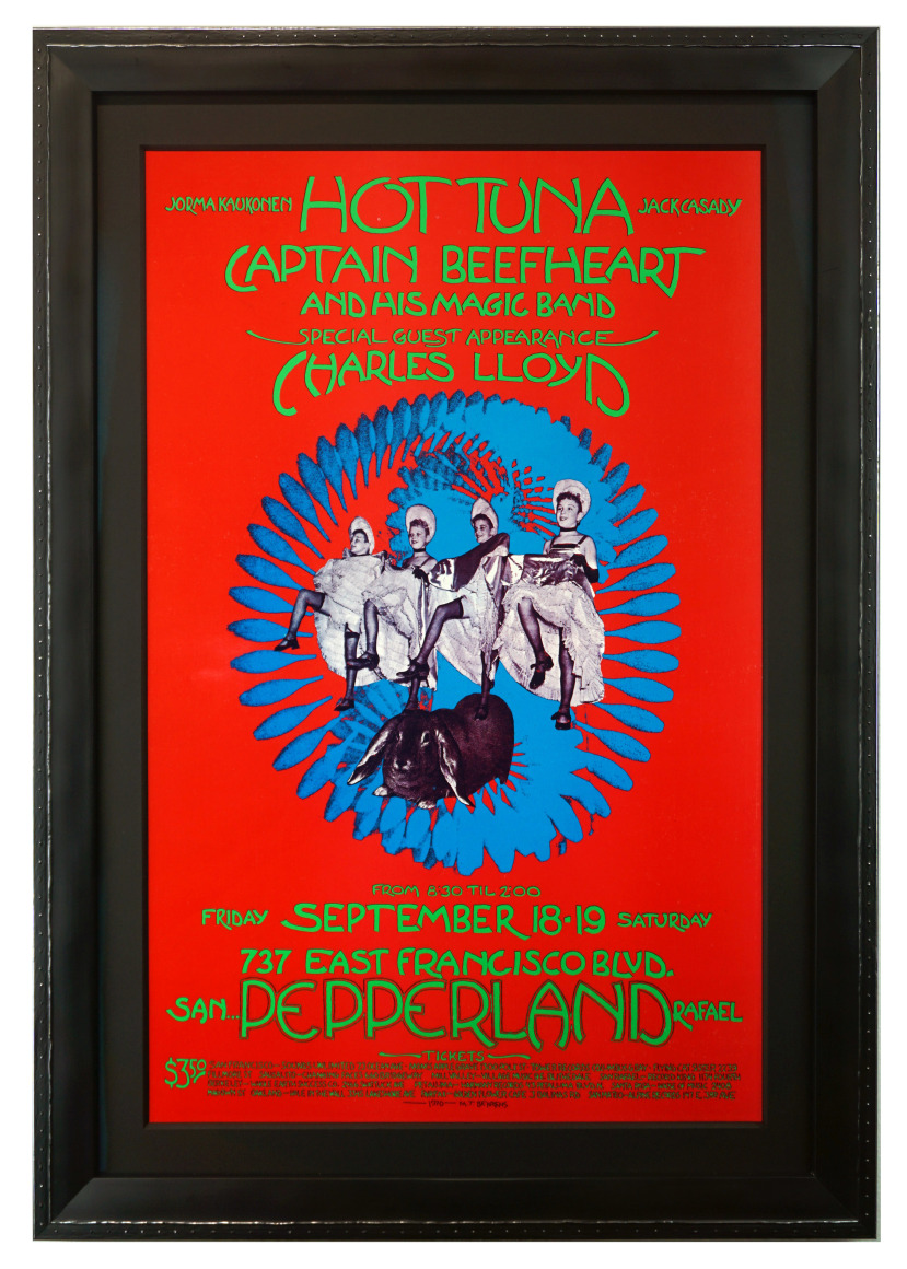 Artist Mark Behrens designed this unusual poster featuring young girls in can-can clothing with a large rabbit in the foreground, splashed in red and blue with green psychedelic lettering. It is a particularly important piece for fans of Hot Tuna because it not only was the opening night of the refurbished Pepperland, but Jorma Kaukonen and Jack Casady performed two acoustic-based shows as Hot Tuna without Jefferson Airplane and received good reviews, signifying that Hot Tuna could survive without the other band to support it. [Hot Tuna concerts up until this gig were always as openers for Jefferson Airplane]