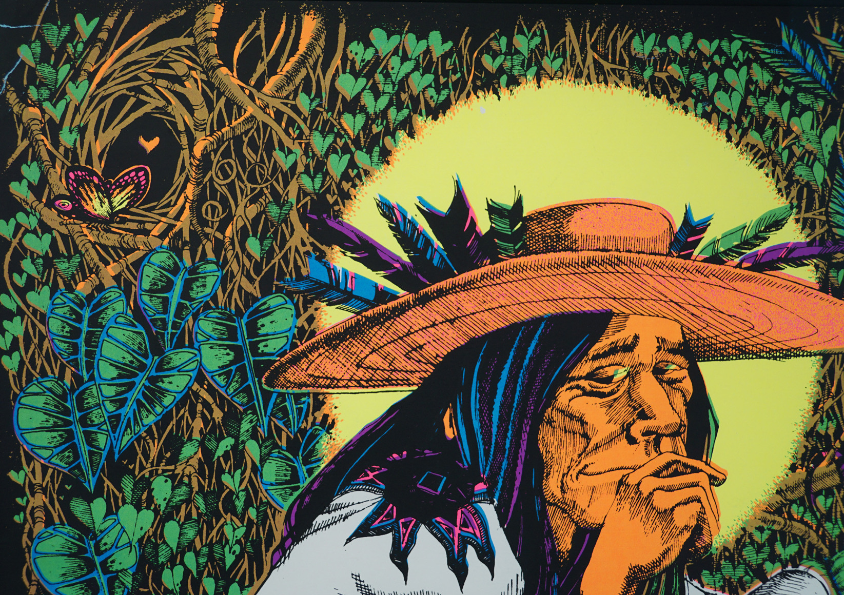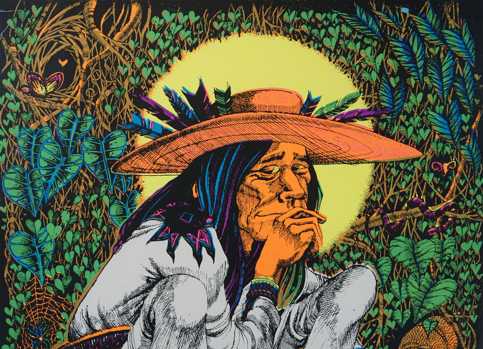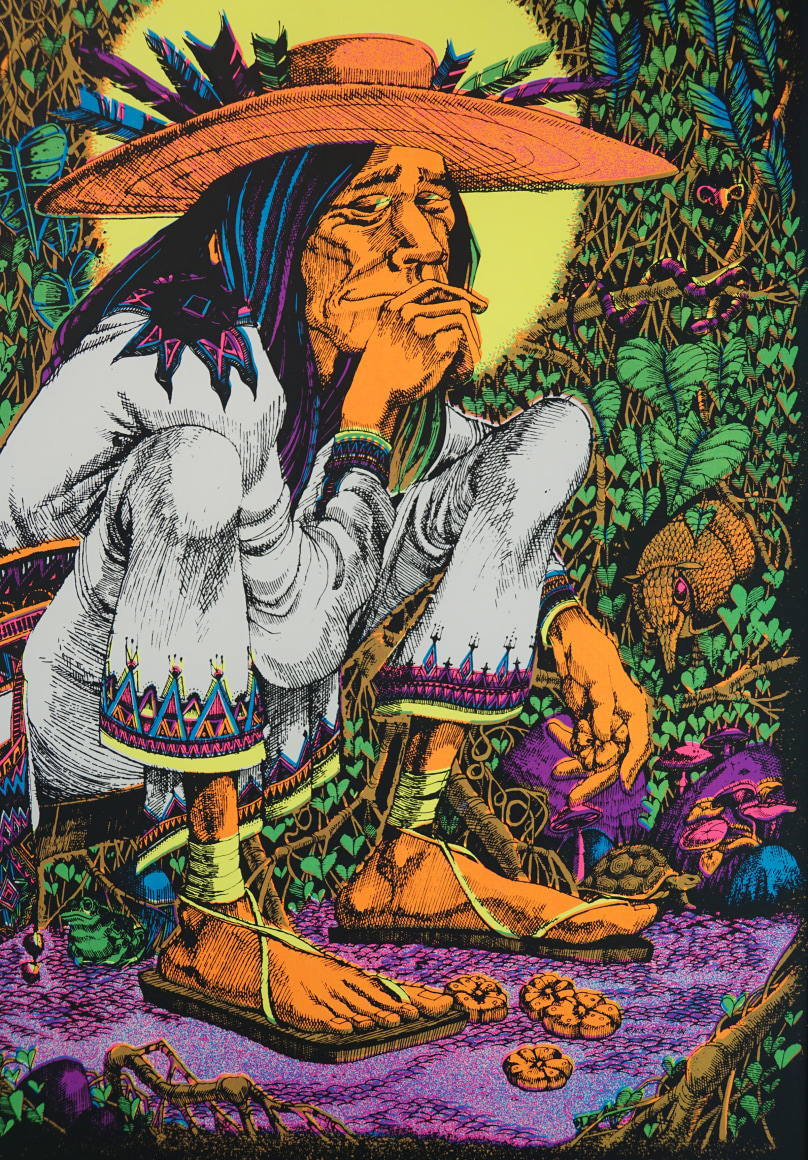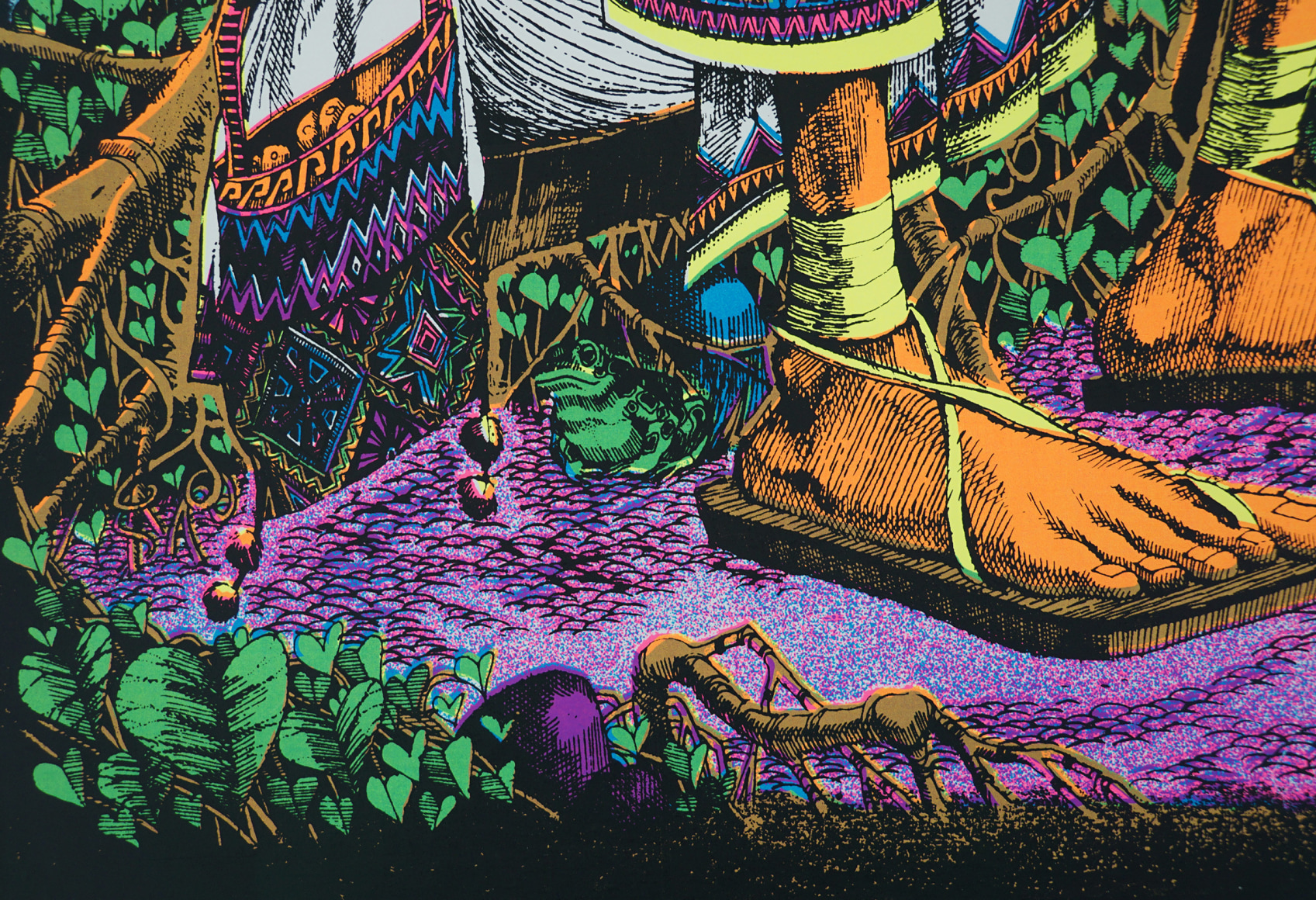 On a journey up into the Sierra Madre mountains, Rick Griffin and his wife, Ida, encountered the Huichol Indians, a shamanistic tribe renowned for art based on peyote-induced visions. The Huichol and their sacred art fascinated Griffin, and soon after, Mescaleros began popping up as recurring motifs in his works. This poster was printed three times by Griffin and there is another unauthorized black light edition in circulation as well.