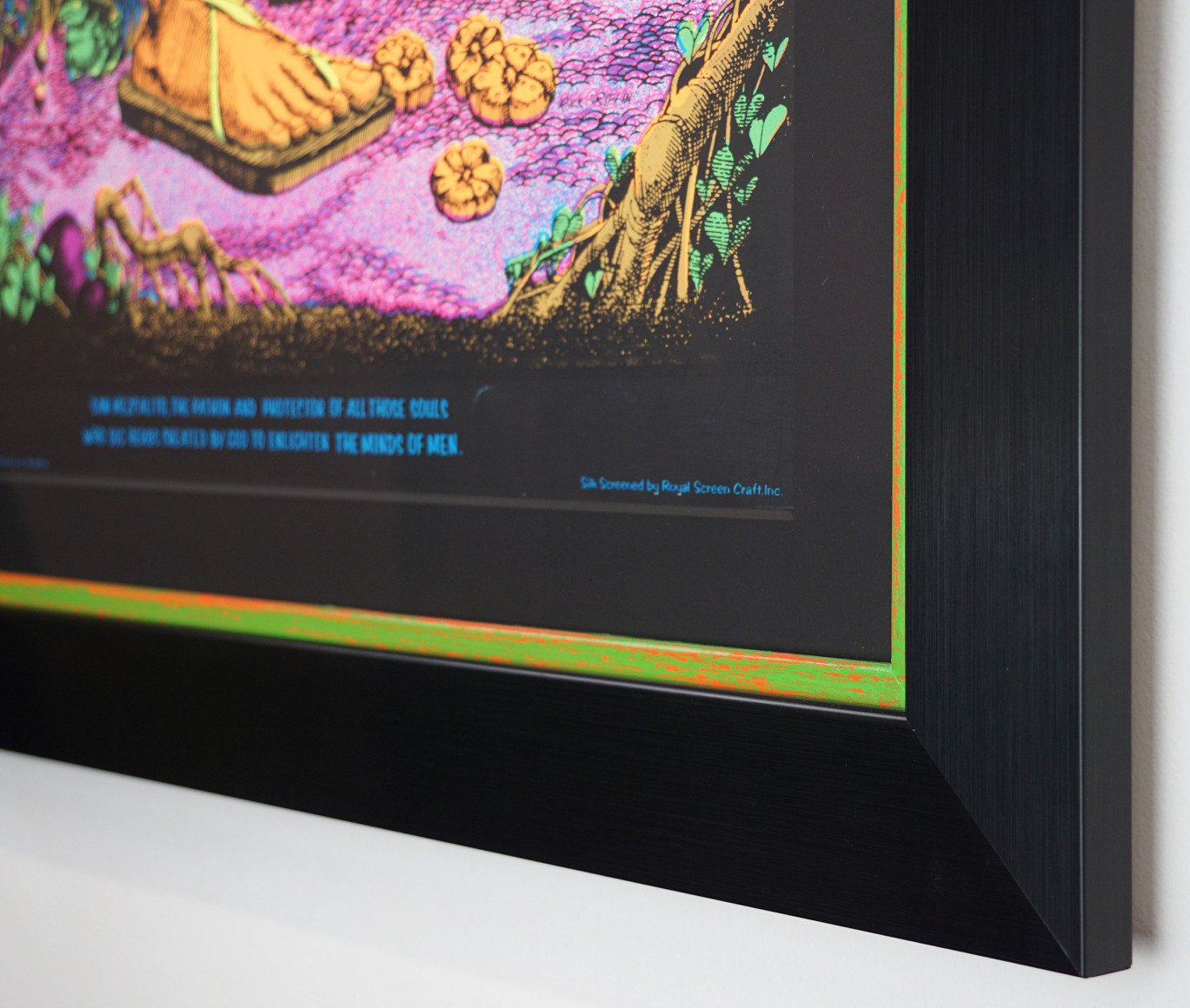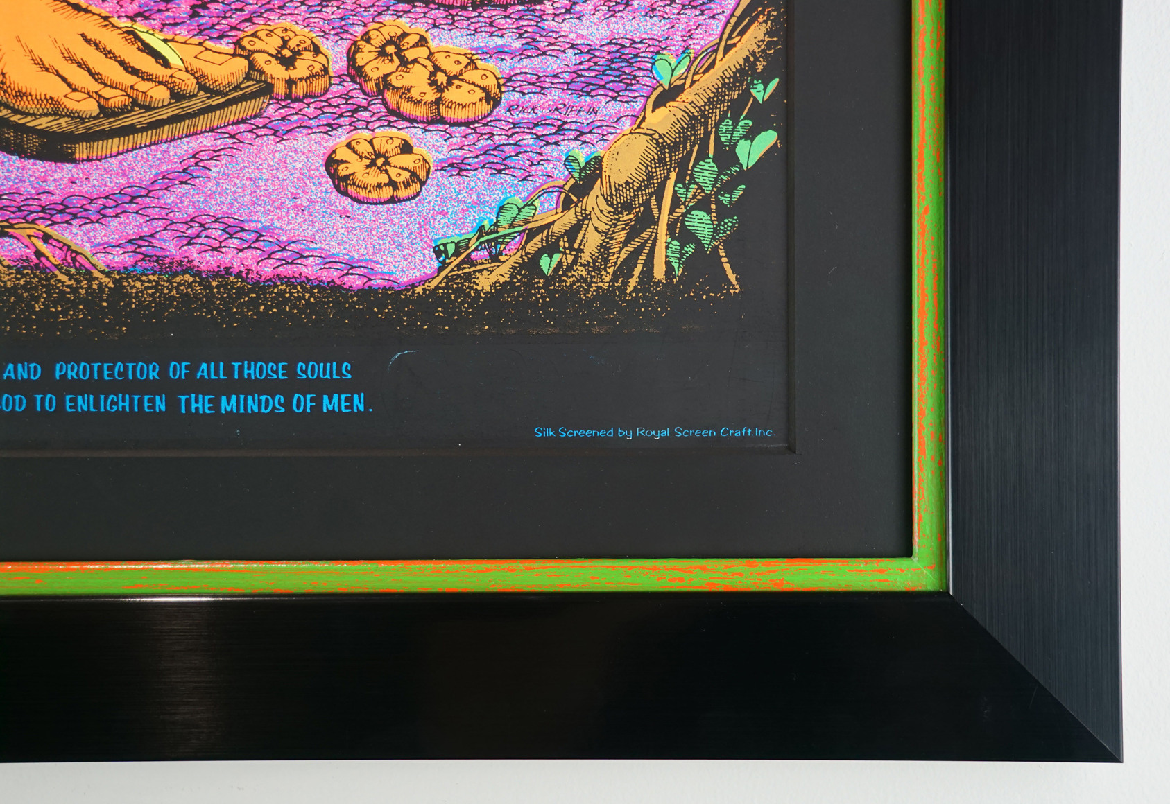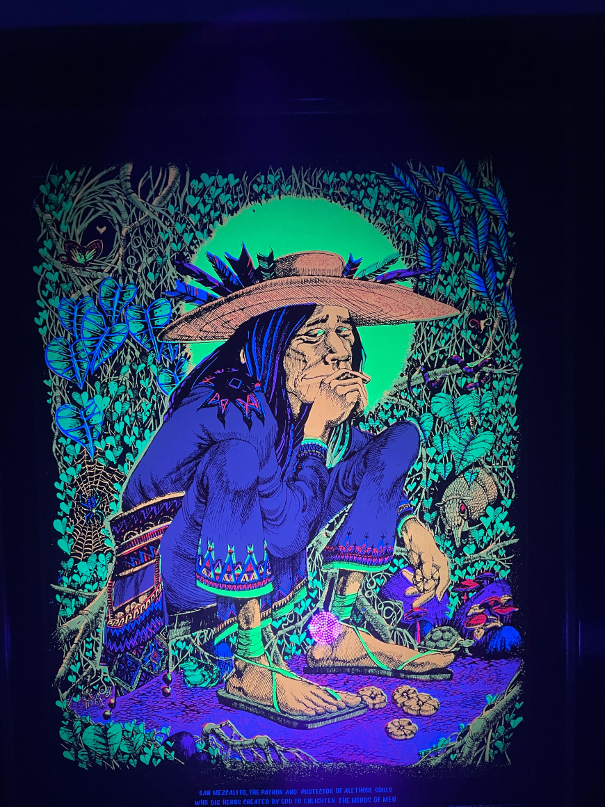 This gorgeous silkscreen poster was designed by Rick Griffin in 1967 and printed by Royal Screen Craft in Los Angeles in 1968. It is featured in "The Art Of Rock", plate 2.359. Its central character is "San Mescalito, The Patron And Protector Of All Those Souls Who Dig Herbs Created By God To Enlighten The Minds Of Men".