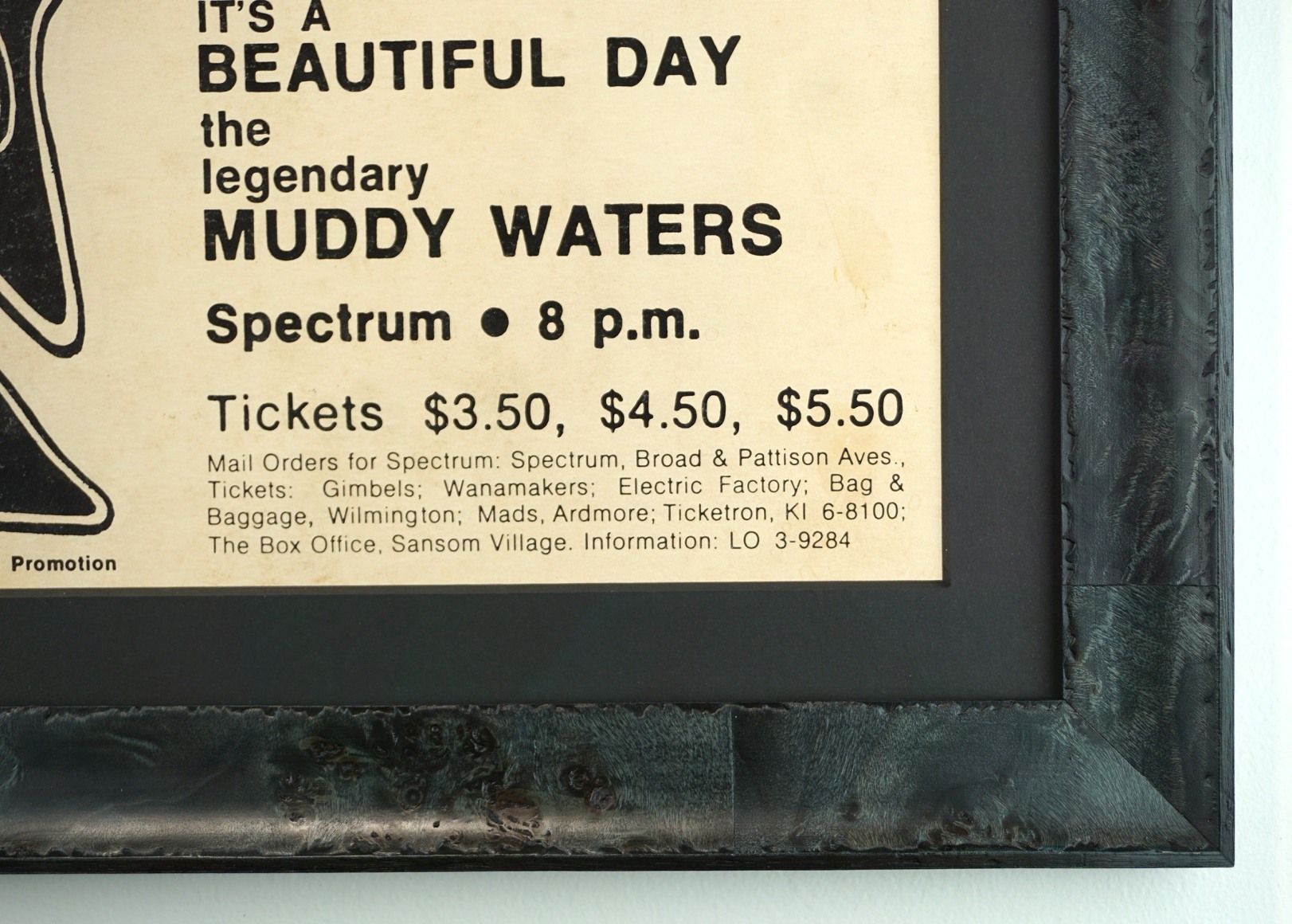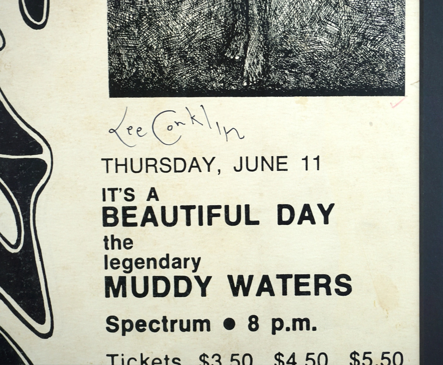 A rare cardboard poster promoting San Francisco-based Santana and It’s a Beautiful Day (“White Bird”) as well as blues legend Muddy Waters. Typically the press run for a piece like this has a press run of 500 or less and this one has the iconic Santana lion image signed by creator Lee Conklin.