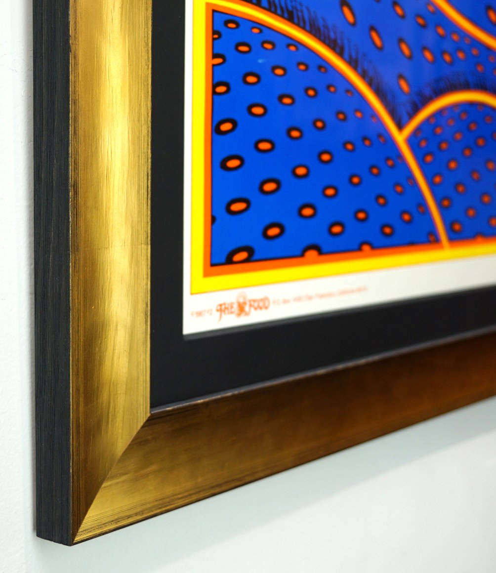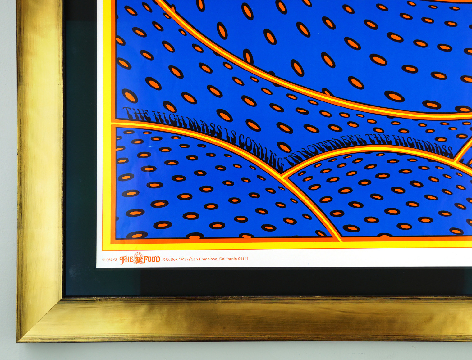 The artwork was created by well-known poster artist Robert Fried who was one of the most highly regarded poster artists of the era. Fried was a trained commercial artist who taught at the San Francisco Art Institute. Like the work of his friend Victor Moscoso, Fried’s formal training gave his work remarkable precision and restraint, creating designs that explored geometry and color in a strikingly unique style. This poster is dated 1967, #2, which was the numbering system for this series by “The Food,” which was Fried’s poster distribution company.