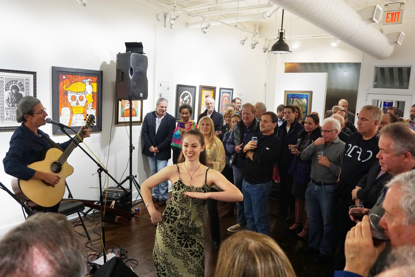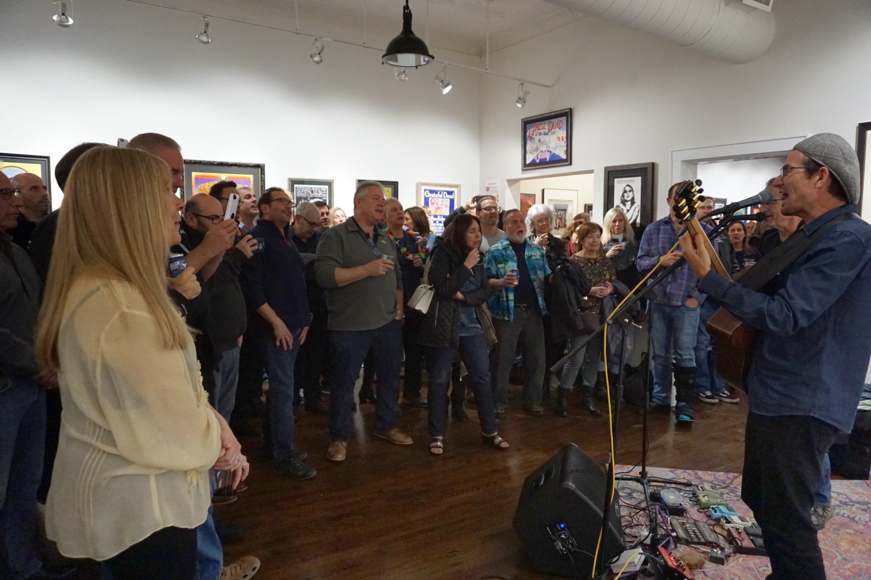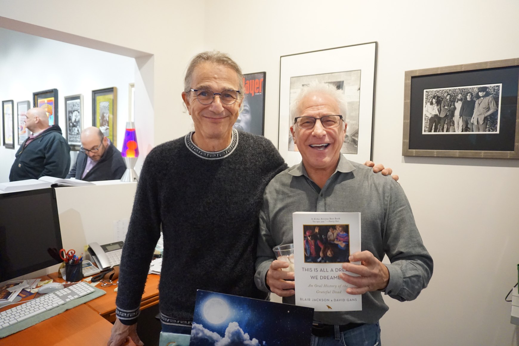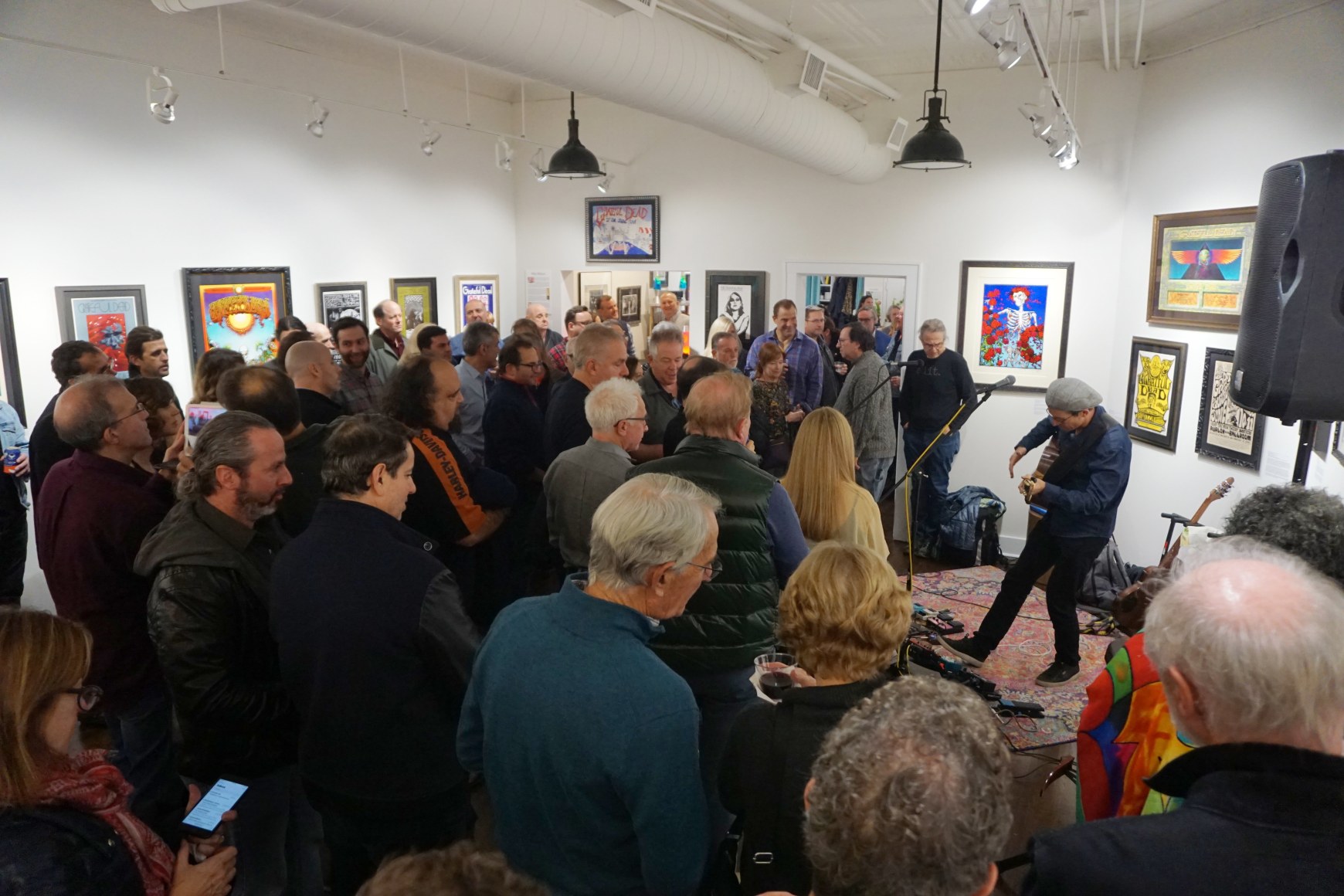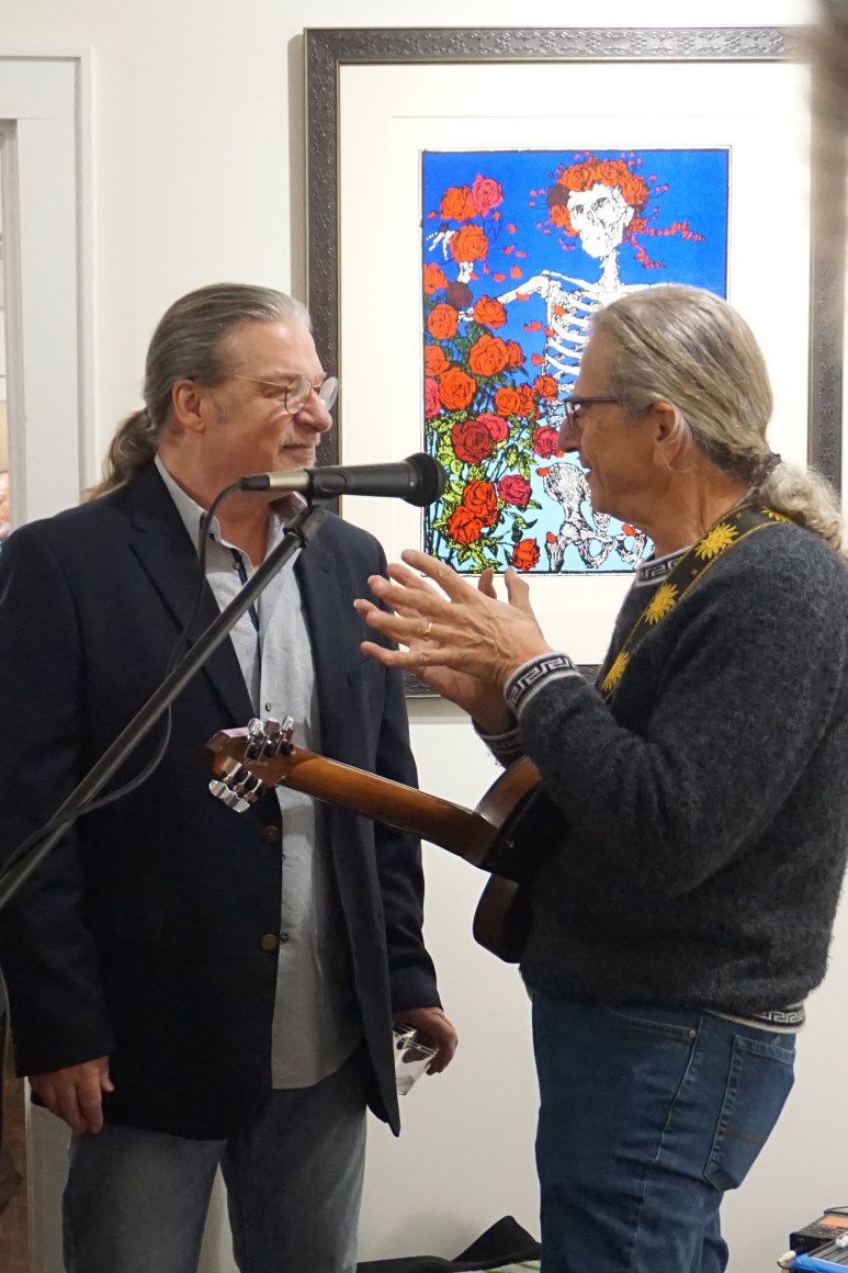 The evening began at 7:00 with guests mingling with David Gans and Stephen Inglis, getting books and CDs signed and enjoying the usual gallery-style refreshments. The setting at the Bahr Gallery included 26 Grateful Dead posters in the main gallery where music was played, while the back galleries held another 40 iconic and rare posters from the entire late 1960s period. By the time the evening was over, 5 pieces had red dots on them. The special Grateful Dead Exhibition continues through December 23.